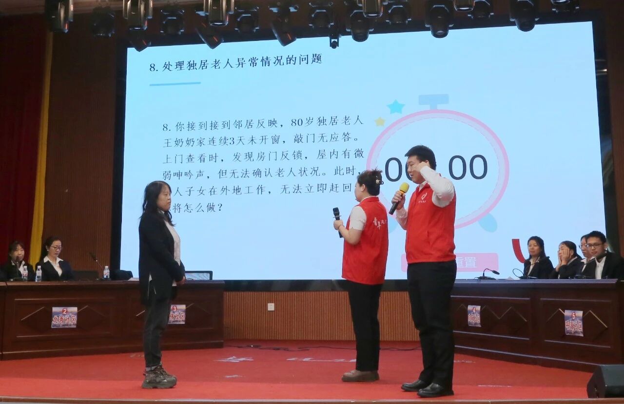 技能大赛通过自我介绍、情景模拟、职业考核三个环节,分别考验5支参赛队伍的选手们对辖区居民情况的了解、社区政策法规、民生服务知识的掌握及应急处置规范,现场还原工作流程、展现服务技巧。