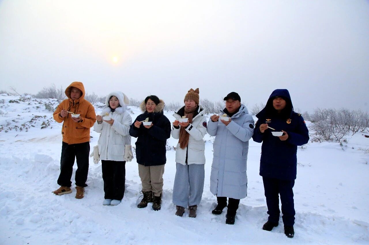 恰逢冬至与2026 年元月前夕,全体参与者手持国旗合影,共享酸菜炖大骨头、东北饺子等特色美食,定格 “跨省同心贺冰雪” 的动人画面。