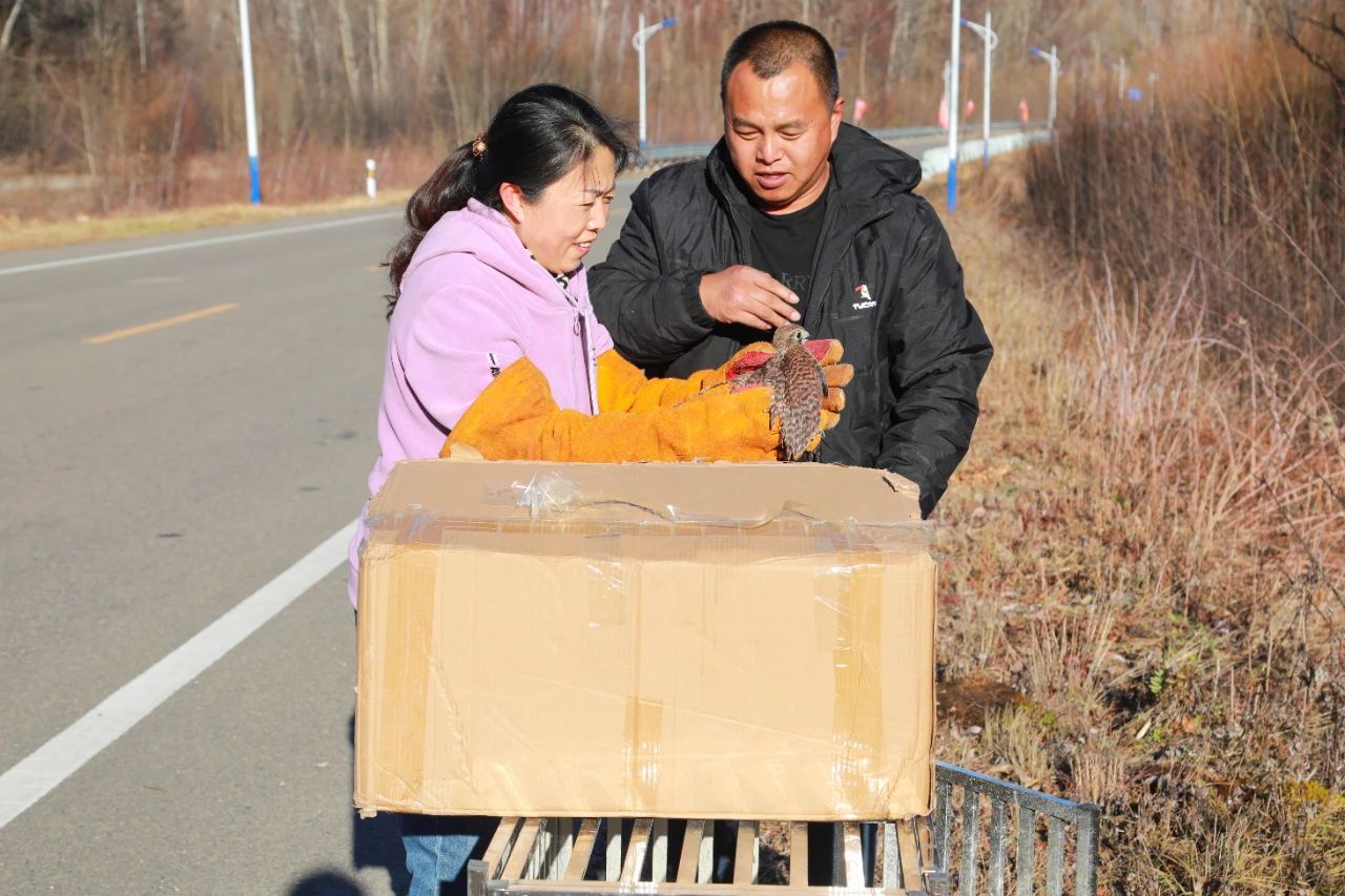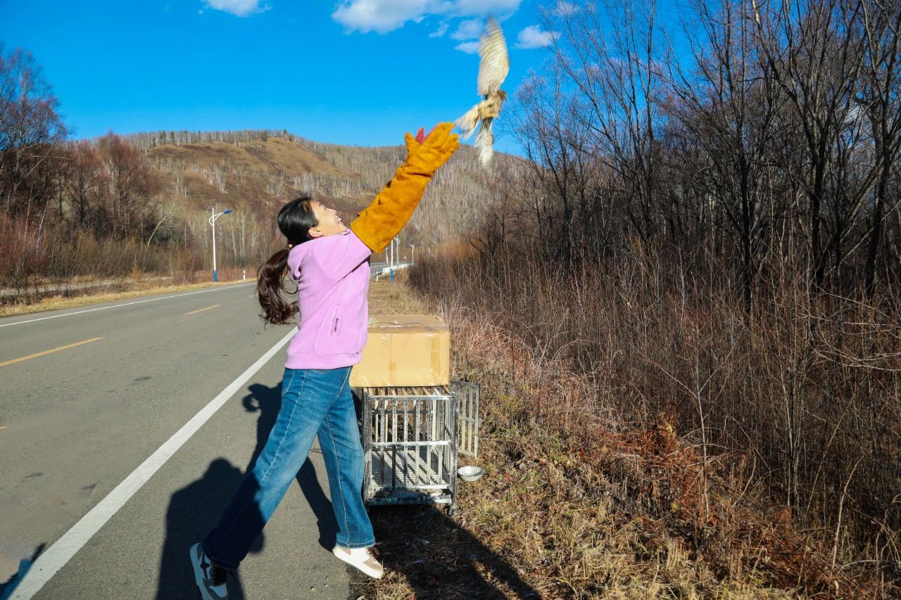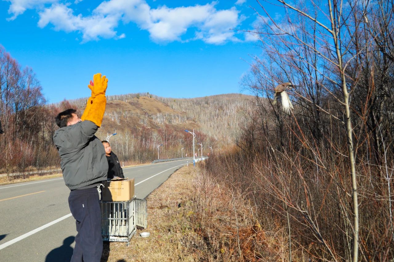 经过3个多月的悉心照料,三只红隼幼鸟已经羽翼丰满,活泼好动,翼展已经达到约50厘米。毛脚鵟也恢复了健康,每天在笼子里上蹿下跳,精力十足。根据它们的恢复情况,工作人员判断已具备放归大自然的条件,于10月12日成功放飞,让它们回归大自然的怀抱。