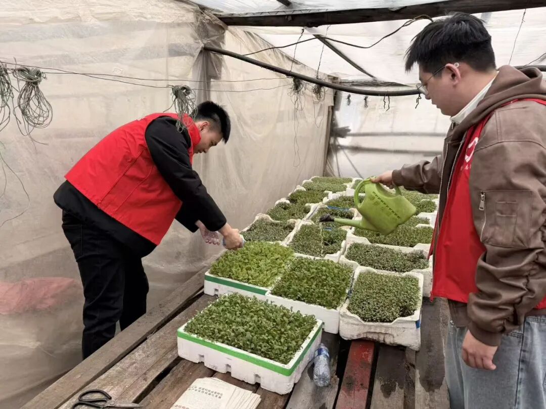 另一队志愿者走进蔬菜种植大棚,扑面而来的泥土气息里满是春的生机。志愿者们主动与种植户交流,仔细查看秧苗长势,询问蔬菜种植技术、产销情况,随后撸起袖子、拿起工具,协助农户为蔬菜浇水、松土,同时送上手套等劳保物资,用实干为农户减轻劳作负担。