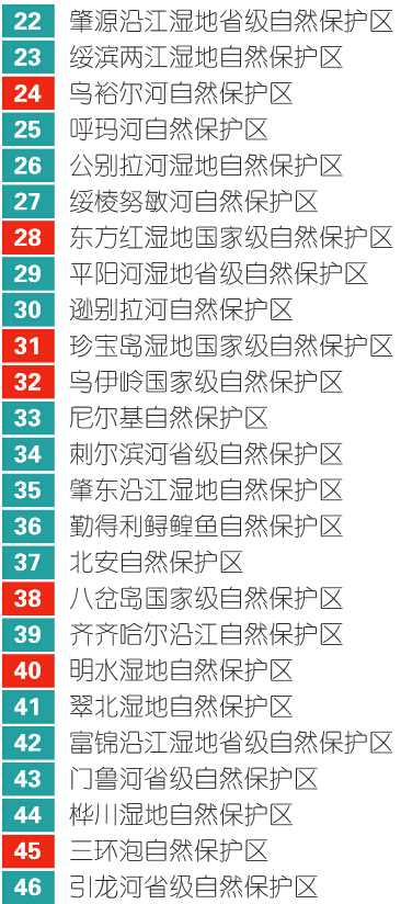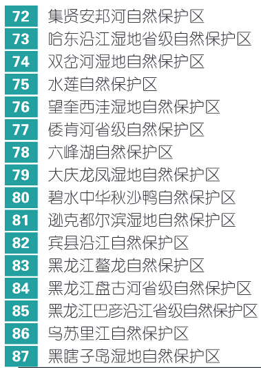 记者10日从中国湿地保护协会成立大会了解到,经过多年措施保护和湿地资源恢复,我国湿地保护率由10年前的30.49%提高到43.51%。据省湿地保护管理中心介绍,目前全国已建立46个国际重要湿地,其中有8个分布在我省,分别是扎龙、三江、洪河、兴凯湖、七星河、珍宝岛、南瓮河、东方红,占据全国的六分之一,居全国之首;我省沼泽湿地面积占全国的五分之一,也居全国首位。另外,我省已建立湿地自然保护区87处。