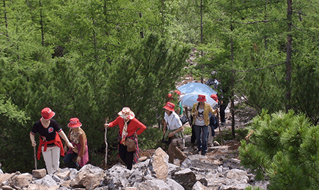 早餐后前往大白山风景区,经过兴安木业工业园区和黑木耳养殖基地,沿途观赏美丽壮阔的“地下森林”景观和秀美山色。登“兴安之巅”(兴安第一峰)——大白山(海拔高度为 1528米 ,是大兴安岭的最高峰,呼玛河发源地),并在登山途中观赏全国最大的偃松园林,游览“仙松迎客”、“白山石海”、“旱地莲花”等景点。亲自动手采摘松籽和野果、蘑菇等天然绿色的山产品。