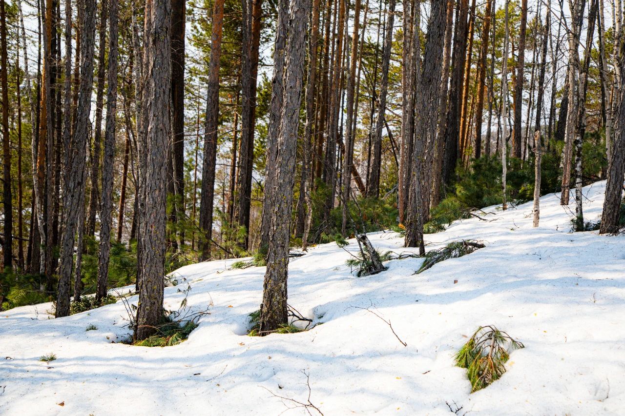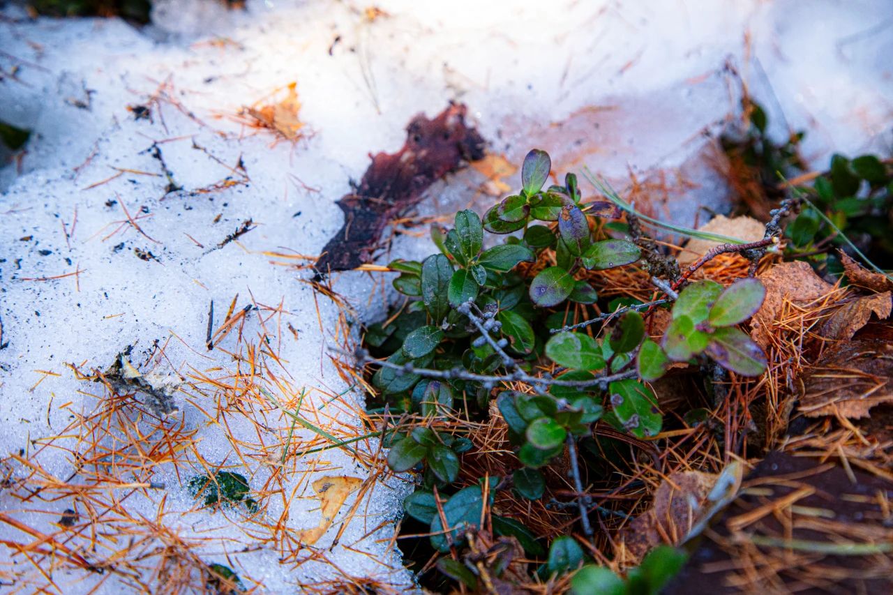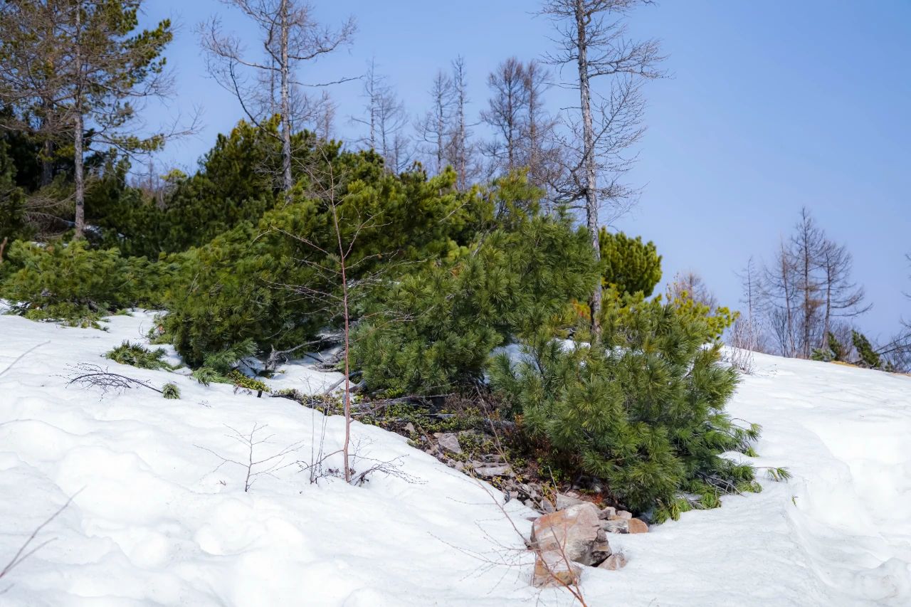 厚重的积雪覆盖着整片山林,平日里挺拔的树木大多被雪掩埋,唯有偃松树展现出顽强生命力。它们虬曲的枝干贴着地面蜿蜒生长,针叶在积雪的重压下依旧泛着墨绿,有的枝干托起蓬松的雪团,宛如绽放的巨型棉花;有的则穿透积雪,在一片雪白中探出针尖般的新绿。