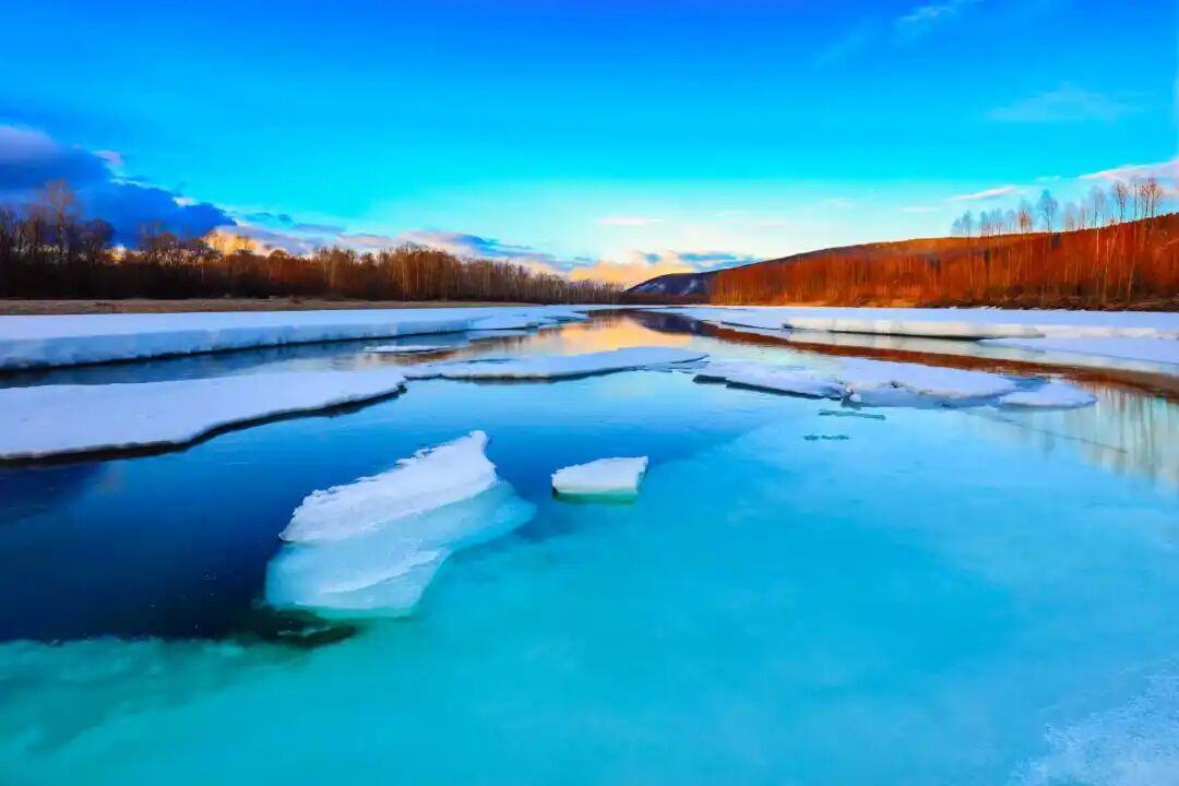 春季以“冰河红柳”著称。呼玛河解冻时,冰块顺流而下,撞击声清晰可闻。河岸两侧的红毛柳枝条转为火红色,与未消融的冰雪形成鲜明对比。