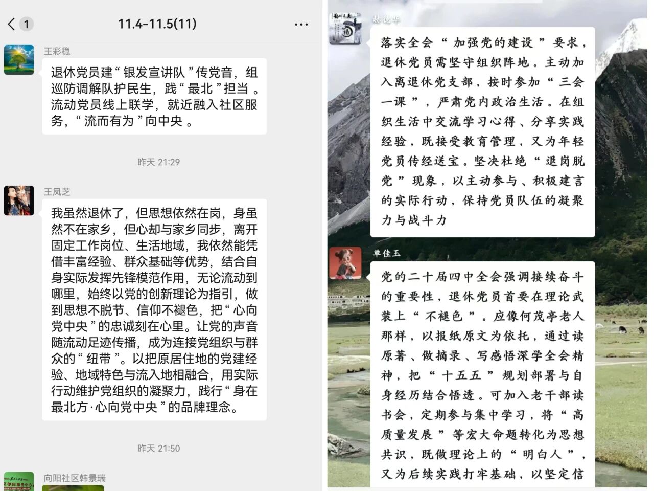 云端送学不断线,层层深入广发动。为确保学习全覆盖、无死角,呼中镇针对流动党员分布广、集中难的特点,充分运用社区流动党员微信群、微信公众号等载体,及时推送学习资料,组织“云”研讨,确保流动党员“离乡不离党、流动不流学”,实现学习教育全员参与、全面覆盖。同时,将党员干部对党的二十届四中全会的深刻感悟制作成短视频循环播放,增强学习吸引力和感染力。使全会精神更接地气、更聚人心,营造了浓厚的学习氛围。