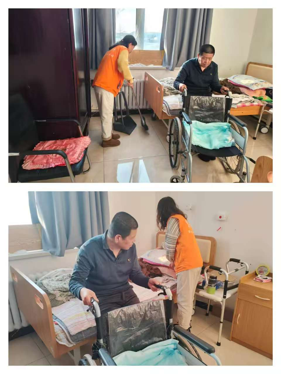上午九点,志愿者们带着满满的热情准时抵达福利院。大家兵分两路,迅速投入到志愿服务中。一部分志愿者拿起扫帚、抹布、拖把等清洁工具,对福利院的公共活动室、走廊、餐厅等区域进行全方位清扫。他们不放过任何一个卫生死角,擦拭门窗桌椅、清运垃圾杂物,忙得热火朝天。经过几个小时的努力,福利院的环境焕然一新,窗明几净的空间让老人们的生活环境更加舒适整洁。