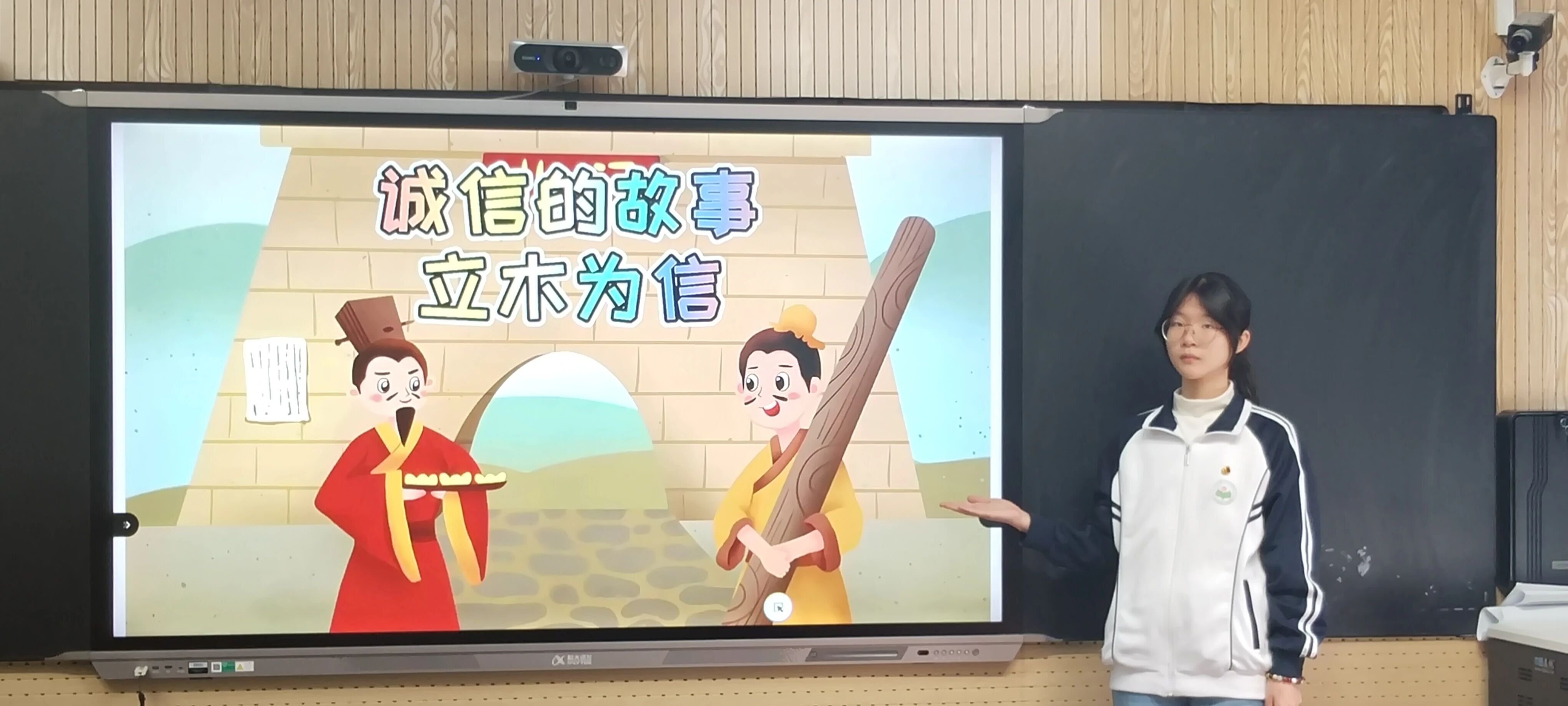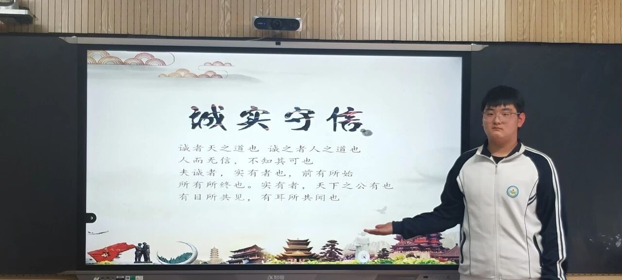 在主题分享环节,团员们踊跃上台,结合精心准备的内容,分享经典诚信故事与名人名言,将抽象的诚信理念转化为生动鲜活的案例。有的团员讲述曾子教子的故事,生动还原曾子为了坚守对孩子的承诺,毅然杀猪兑现诺言的情节,让大家深刻懂得父母以身作则、坚守诚信对子女的深远影响,明白“言必信,行必果”的道理;队员代表分享了立木为信的历史典故,讲述商鞅通过南门立木取信于民,为变法推行奠定基础的故事,让团员们感受到诚信对于树立威信、凝聚力量的重要作用;还有团员诵读“人而无信,不知其可也”“诚者,天之道也;思诚者,人之道也”等经典名句,带领大家重温中华优秀传统文化中关于诚信的至理名言,感悟诚信文化的深厚底蕴。一个个脍炙人口的诚信故事,一句句铿锵有力的诚信名言,引发了在场团员们的强烈共鸣。大家认真聆听、积极交流,纷纷结合自身学习和生活实际,畅谈对诚信的理解与感悟,分享身边的诚信小事,许下诚信做人、诚信学习、诚信待人的青春承诺。现场氛围热烈浓厚,诚信的种子在每一位团员心中悄然生根发芽。
