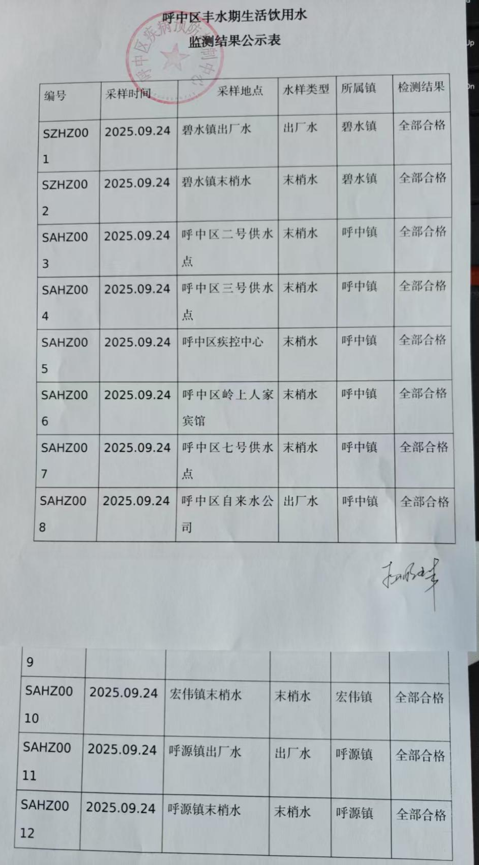 呼中区丰水期水样共12份,水样均合格,无不合格水。